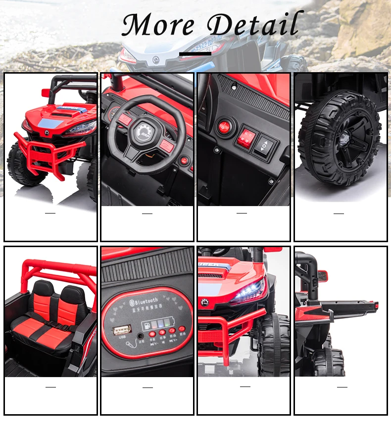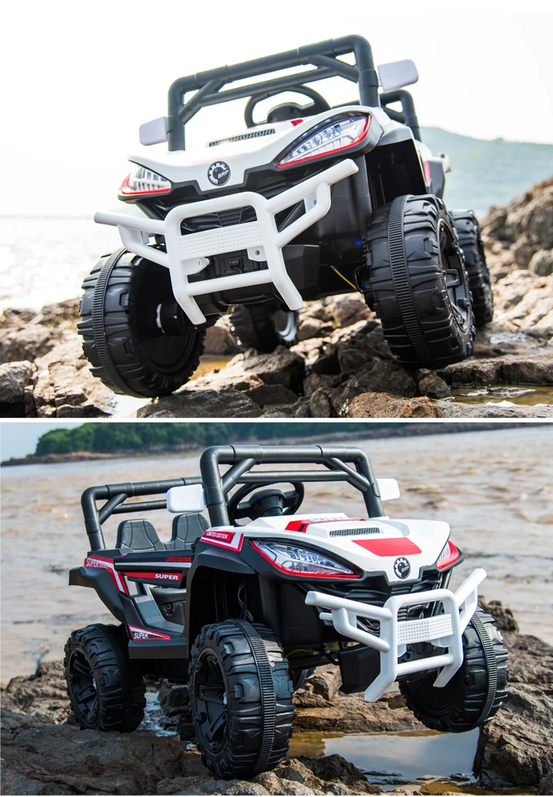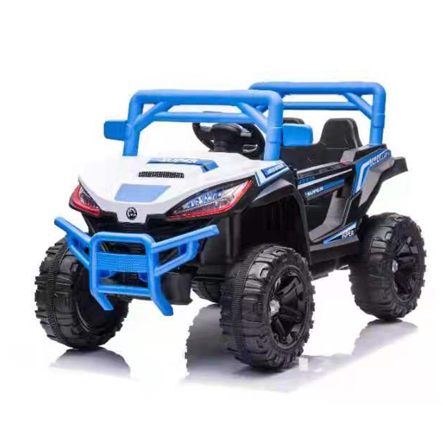 Safe ride on Jeep is composed of a non-toxic plastic body and a 4-wheel design for added safety. Built with a vibrant colorful frame, LED lights, daring stickers, Forward and backward, music, lights, rear wheel suspension, early education function, music, story, English, battery display,USB port, MP3 port and integrated music and horn sound. Electric kids jeeps includes: 3 Motor, 12V battery and charger, gear shift switch, rearview mirrors and foot pedal control and remote-control facilities as well as phone application facilities